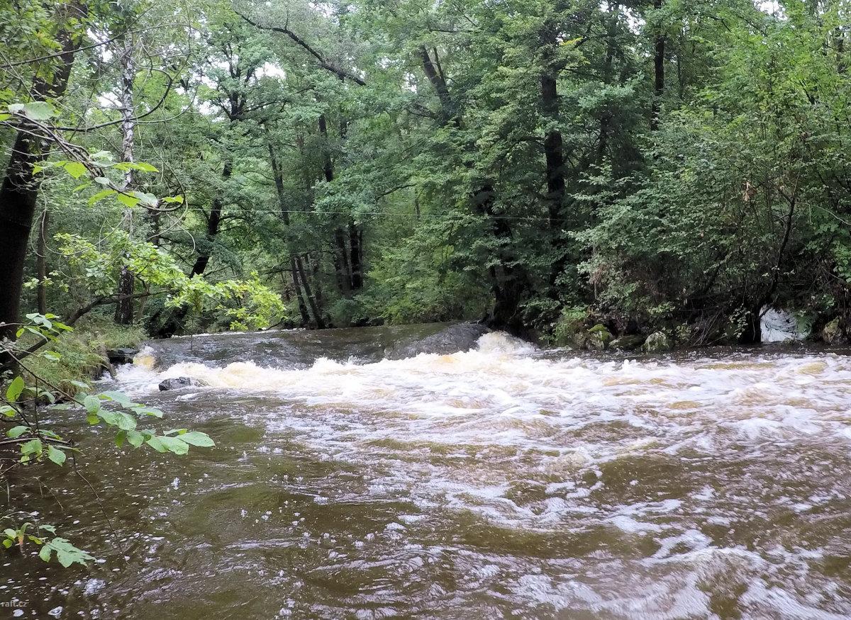 Blanice, úsek Záblatí/přehrada 8.6.2013, cca 9m3/s v Podedvorech, po povodni rozbitý jez u Zábrdskéh ...