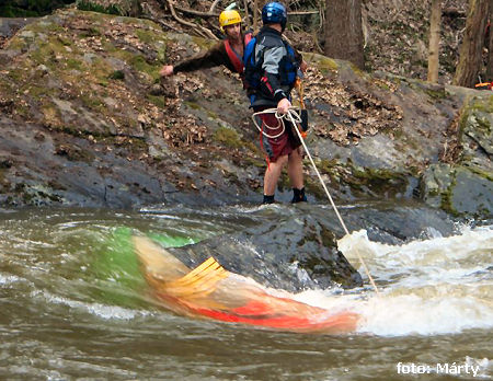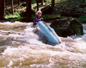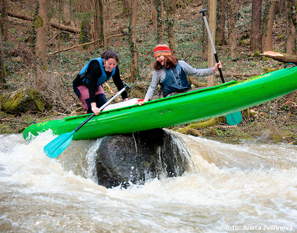 přistát lewo, před zatáčkou doleva, nájezd do soutěsky koryta. Řeka vtéká mezi skalní bloky a přes kameny padá do cca 2 m úzkého místa se spádem cca 5 m, poslední stupeň je podle vody vysoký cca 1,5 m, dole laguna. Za opt. vody przejezdne - prohlédnout !! Jistit je lepší z pravého břehu, celé lze přenést vlevo po červené značce. Nebezpečí zaklínění a padlého stromu !! Po 30 m hned další sklaní stupeň wysoki (m) 2,0 przejezdne prawo, !! kámen pod vodou vlevo – prohlédnout. Následuje řada balvanitých stupňů s možnými stromy v průjezdech !! celé WW IV !! Lze přenést lewo, po červené značce až k lávce. 0,6 km |