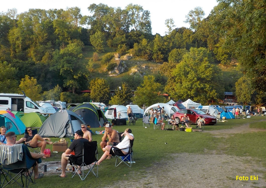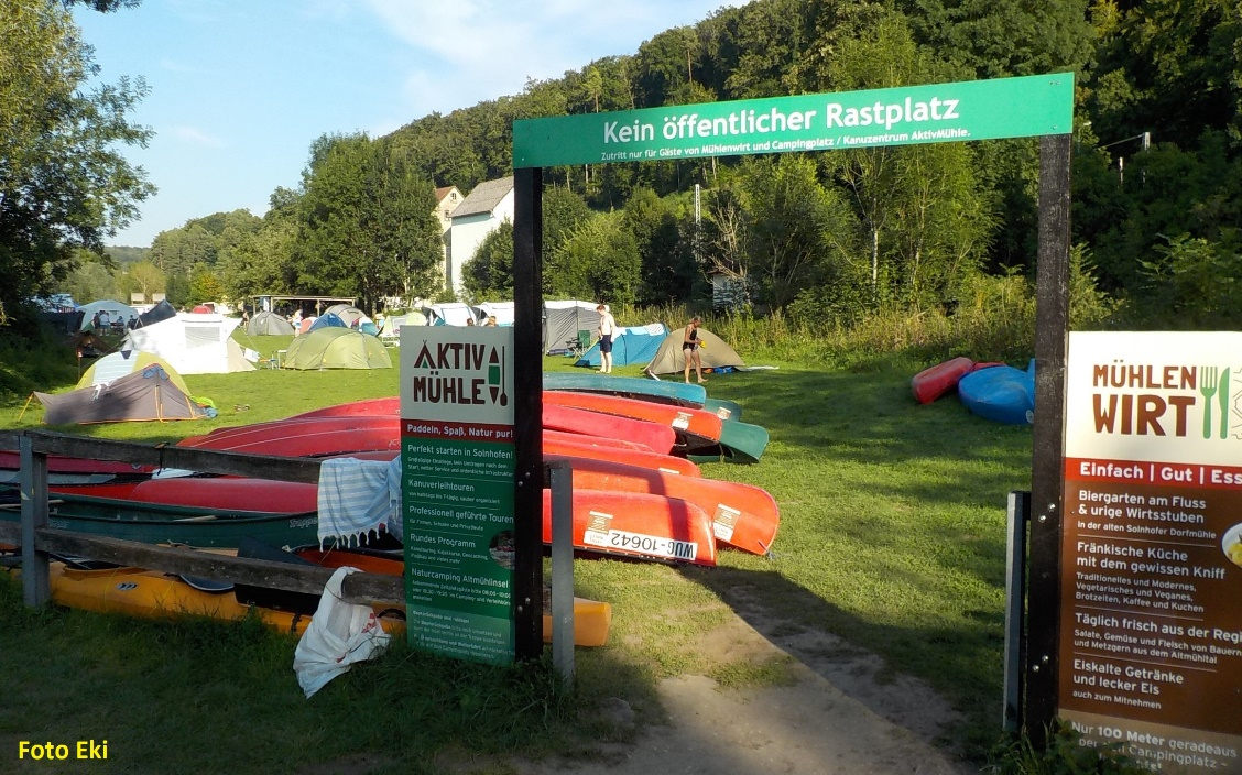 No, nepočítali jsme je. Slunce se koulí k západu. Hledáme nocleh. Bohužel se tu v přírodním parku oficiálně nedá volně stanovat. Doplouváme k jezu Hammermühle, kde je oficiální tábořiště. Stavíme na okraji toho turisticko-cyklisticko-vodácko-motoristického mumraje stan.