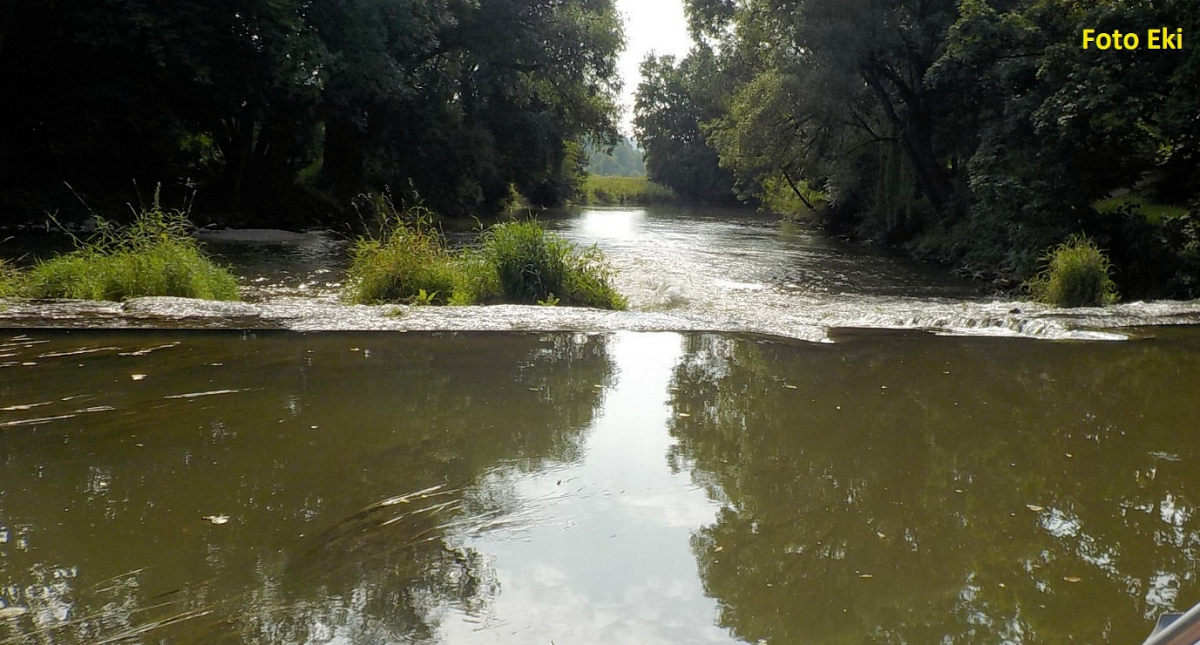 Řeka mírně proudí plochou krajinou. Zajímavé jsou některé vodní rostliny, jako třeba šípatka střelolistá, která se u nás vyskytuje spíš na rybnících. O kousek dál potkáváme skupinku vodáků. Jedna kánoe se tu na naprostém voleji cvakla, ostatní jim s úsměvem pomáhají, voda je teplá.