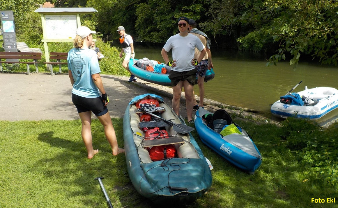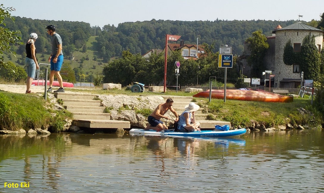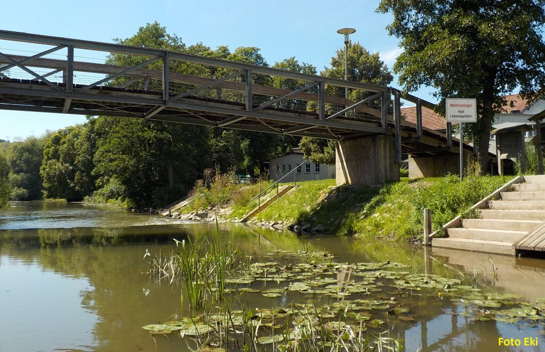 Před jezem v Pappenheimu jsou vybudované vodácké výstupní schůdky. Kocháme se českými vodáckými výrobky v německých rukou.