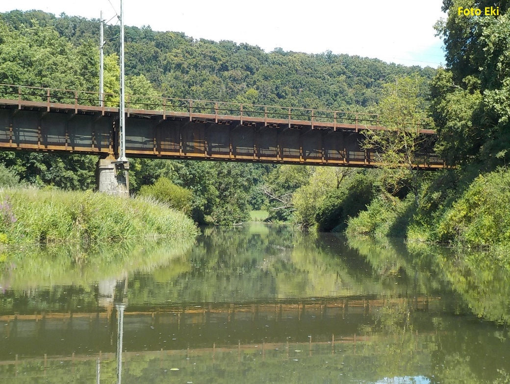 Za zákrutem objevujeme chutné ostružiny, které trháme přímo z vody. Břehy zpestřují kvetoucí motýlí keře a modré trnky. Řeku občas překříží rezatý most železnice.