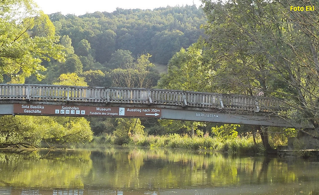 Doplouváme k městečku Solnhofen. Tady byly při těžbě jemných lithografických vápenců nalezeny krásné zkameněliny, nejznámější z nich jsou zbytky prvních ptáků (Archeopterix). Cedule na místní lávce zve k návštěvě muzea těchto praptáků.