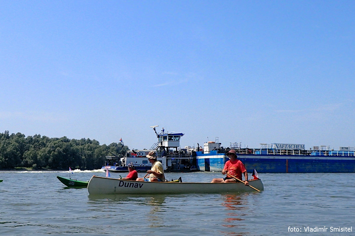 Není čas vše zdokumentovat a spěcháme na vodu. Je poledne, a abychom neztratili den, máme dnes doplout do Apatinu, bratru 24 kilometrů. Což není moc, protože Dunaj zde přece jen teče, ale ty pláže cestou! A to vedro nutící na nich zastavit a vykoupat se! Fotíme se a vyrážíme na vodu. Podplouváme most a noříme se do království řeky. Držíme se srbského břehu. Sáva nadhazuje vykoupat se na krásné pláži na břehu chorvatském, raději mu to rozmlouvám. A činím dobře, v mžiku je zde chorvatský policejní člun a vyhání nás za půlku řeky: „Máte srbské vlajky, tak zmizte k srbskému břehu!“ První a poslední nepříjemný kontakt se všemi orgány, které ještě potkáme (pokud tedy vynechám mé vnitřní orgány zdivočelé průjmem, který mne a dalšího kamaráda v druhé části cesty postihne).