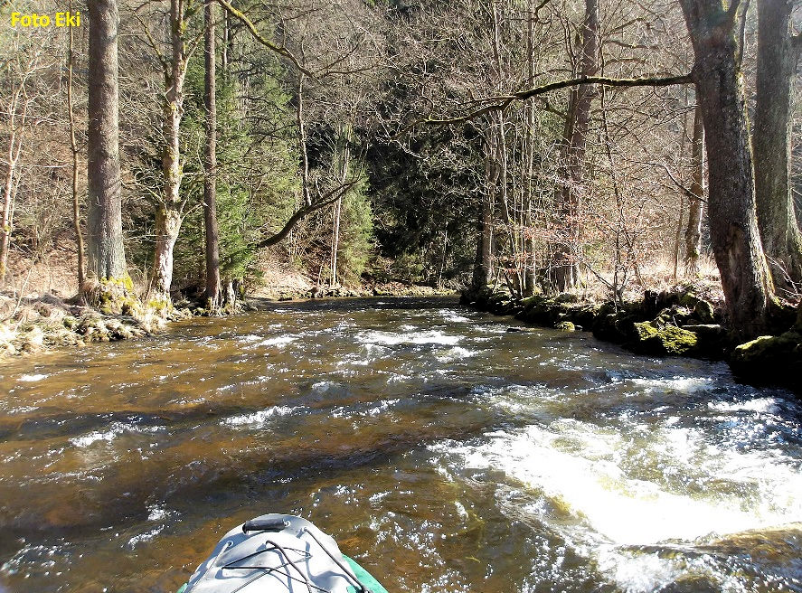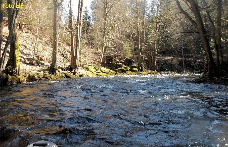 Čirá mírně rašelinná voda příjemně teče, občas bylo potřeba se vyhnout většímu šutru. Za mojí plavby protékalo dole v Klášterci 5 m3 za sekundu, tady o krapet méně.