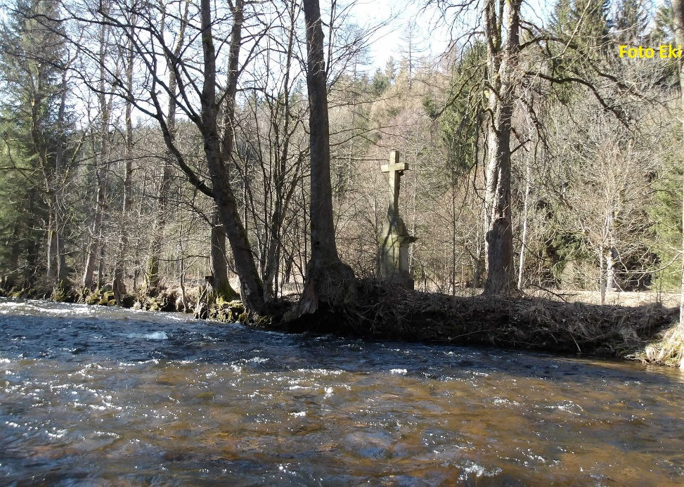 Na český břeh se vrátila silnice, na břehu u ní mě zaujal historický kamenný kříž.