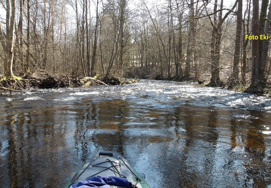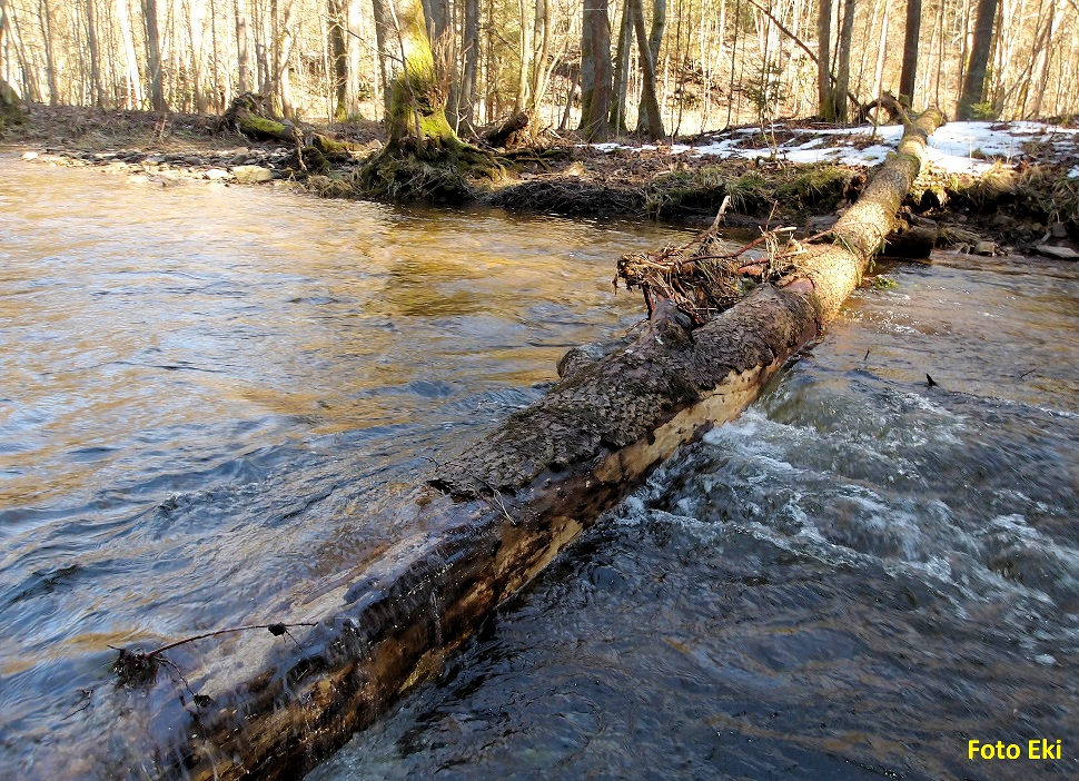 Na březích tál sníh. Plavbu mi zpomalil jen jeden kmen stromu padlý zcela přes řeku, který ovšem bylo možné přešoupnout bez opuštění lodi.
