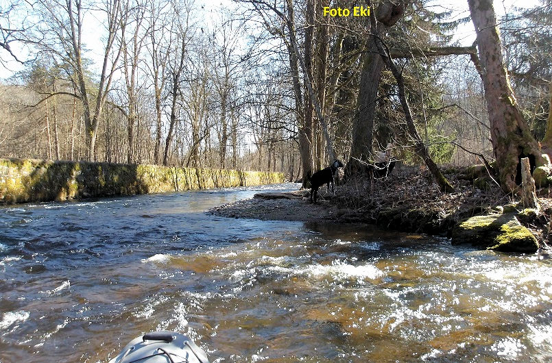 Pak mě příjemná peřejka nanesla do zbytků bývalého jezu. Ten leží za pravotočivou zatáčkou, místo bylo přehledné a sjízdné.