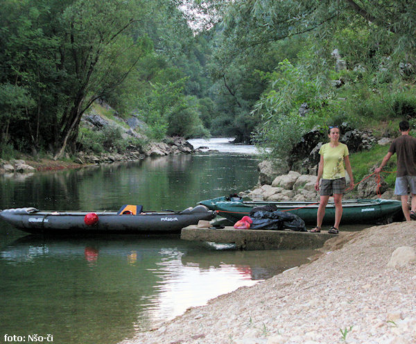 Táboříme pod Drvarem těsně před vstupem do kaňonu. Unac je teplá říčka na minimu sjízdnosti skákající přes kameny kamsi na severozápad. Usínáme pod hvězdami jen co odešli poslední rybáři. Ráno vyjíždíme autem proti proudu zpět k silnému vývěru přítoku Unca, aby to dnešní plutí nebylo moc krátké. Nebylo. Nafukujeme všechny tři Pálavy u hotelu, kde necháváme stát i auto. První úsek skutečně stál za to: úzká říčka se vine vrbovím. Za chvíli je tu soutok a křoví houstne víc, nevidíme nic. Občas musíme skočit do vody mezi přibývající odpadky a protahovat lodě pod či přes ostré větve blokující nám cestu. Bylo vedro a spousta komárů.