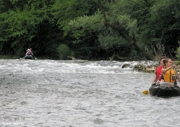 Za hodinku meandry končí a Unac nás poklidně unáší kolem našeho opuštěného tábořiště do stínu mezi zdvihající se pahorky. Vody je málo, takže na nic nečekáme a vjíždíme do každé peřejky beze strachu. Je ale třeba pečlivě vybírat cestu, poněvadž existuje většinou jen jedna správná cesta vpřed. Nezvolíš-li správnou mezeru mezi kameny, musíš vyskočit a přenést loď. Baraky by tudy neprojely. Dofukujeme Pálavy na maximum, abychom měli co nejmenší ponor, a užíváme si obtížnost WW I-II. (někdo by řekl spíš technická III :). Za větší vody to tu bude dost náročné, obzvláště proto, že tu a tam řeka končí například v jeskyni, kde se voda točí ve velké dutině, atp.