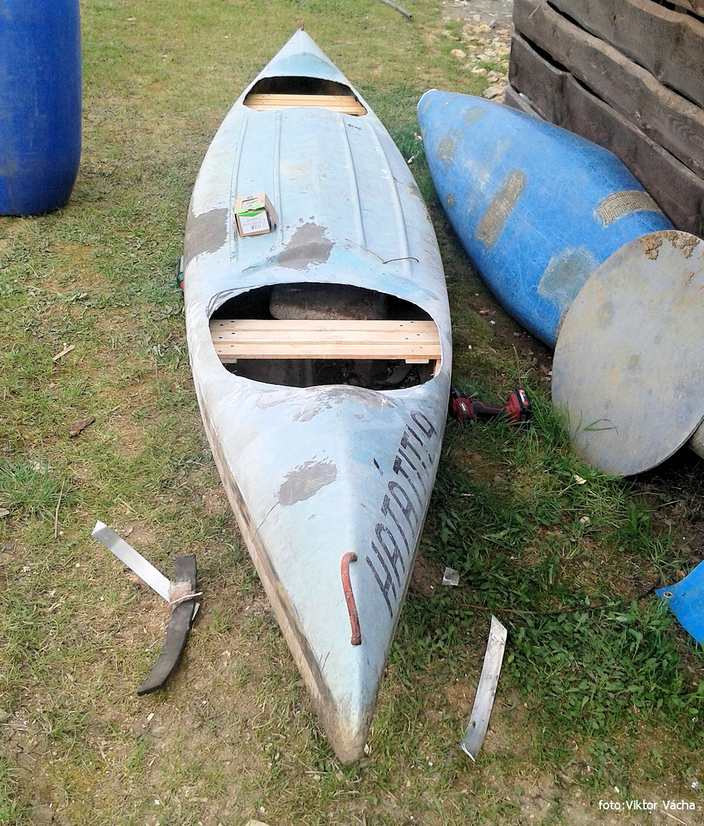 Je tomu cca rok, co jsem brouzdal na různých stránkách a bloumal, co kde mají s vodáckou tématikou. Hledal jsem hlavně inzeráty na prodej zbytků tkanin a střiží na opravu lodí. V tom mé opravářské srdíčko zaplesalo. Inzerát jak rozený pro mě, spoustu zbytků a za pár korun. A k tomu malý bonus – starou loď. Tak fajn, vezmu si ji taky a opravím ji pro kamaráda, který loď shání. Nechtěl jsem za to vše dát více jak 2tis, což jsem s rezervou splnil.
