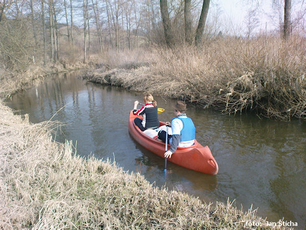 V počátcích se řeka klikatila mezi vrbičkami vcelku příjemným tempem. Občas se nám dostalo zpestření v podobě peřejí či zákrut nebo hustého porostu. V některých místech nám vrbičky takřka zatarasily cestu, ale pořád ještě zbývalo trochu místa na průjezd. Nad Podlouňovickým mlýnem přišel na řadu první "volej", který končil až u silničního mostu, jehož dva oblouky přepůlily řeku na dvě části - sjízdnou pravou a nesjízdnou levou stranu. Po pravé straně to trochu dřelo, ale dalo se to sjet i ve dvou.