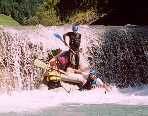 Bohužel jsme vzali raft a Orinoco, ostatní nafukovačky mám v kempu. Nejprve si jdeme s raftem skočit poslední stupeň. Vzhledem k tomu, že vody není mnoho, není pod jezem žádný vývar, naopak pěkný bazén, a tak si skáčeme 2m vysoký jez. Nad jezem ještě upozorňuji dva háčky: "Chlapi, až budeme na hraně jezu, zakloňte se do lodě. Jasný?" Pro jistotu provádíme i nácvik před jezem. Samozřejmě, přijedeme na hranu, padáme a háčkové se zaklání. Jeden správně, druhý pozdě a už ho to háže nárazem o vodu přes bort. Vzhledem k tomu, že já sedím vzadu uprostřed, tak tato malá nerovnováha při dopadu dělá své. Loop, a už mě to vykopává ven.