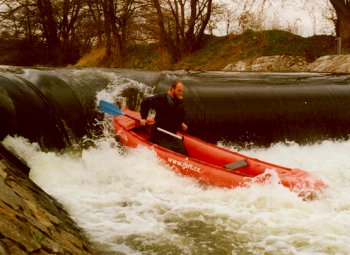 Najíždíme,skáčeme asi 1m a jsme ve válci. Ten nás okamžitě odhazuje vlevo, ale tento náraz čekáme, takže bez problému se dostáváme do vracáku. Výborně, i druhý jez jsme sjeli. Následuje další kilometr a volej se stává ještě volejovatější. Je zde poslední jez naší plavby – asi 2m vysoký s deskami 30cm pod jezem na zmírnění proudu vody a podemílání jezu. Ve dvou to nepůjde – špice by se chtěla zabořit, ale byla by odražena deskou, což by mohlo háčka pěkně katapultovat. V jednom se špice sklouzne a záď dopadne až za desku. Poslední přípravy, foťáky jsou vytaženy a jdu do toho. Skáču ho bez problému a vysluhuji si potlesk od ostatních přihlížejících.