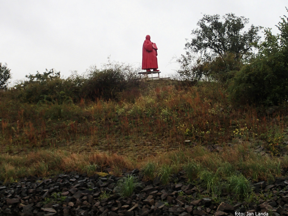 Martina Luthera, červenějšího než moje spálené nohy, stojícího na břehu u vjezdu do
