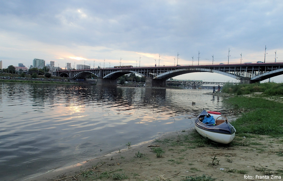 V pátek už nás čekala plavba do 20-25 km vzdálené Varšavy. Cestu nám docela znepříjemnila stavba mostu nějakých 8 km před cílem. Wisla zde byla přehrazena pontonovým mostem a obtížné překonání této překážky nám trvalo 3/4 hodiny. Po chvíli za tímto mostem jsme ale už viděli výškové budovy Varšavy a v 14:30 jsme tam dopluli. Naši plavbu jsme ukončili na pravém břehu kousek od moderního Národního stadionu. Zdenda s Mílou dojeli vlakem do Tomaszówa pro auto a my zatím hlídali lodě. Protože se vrátili docela pozdě, vyspali jsme se ještě v jednom varšavském autokempu a v sobotu ráno vyrazili k domovu.