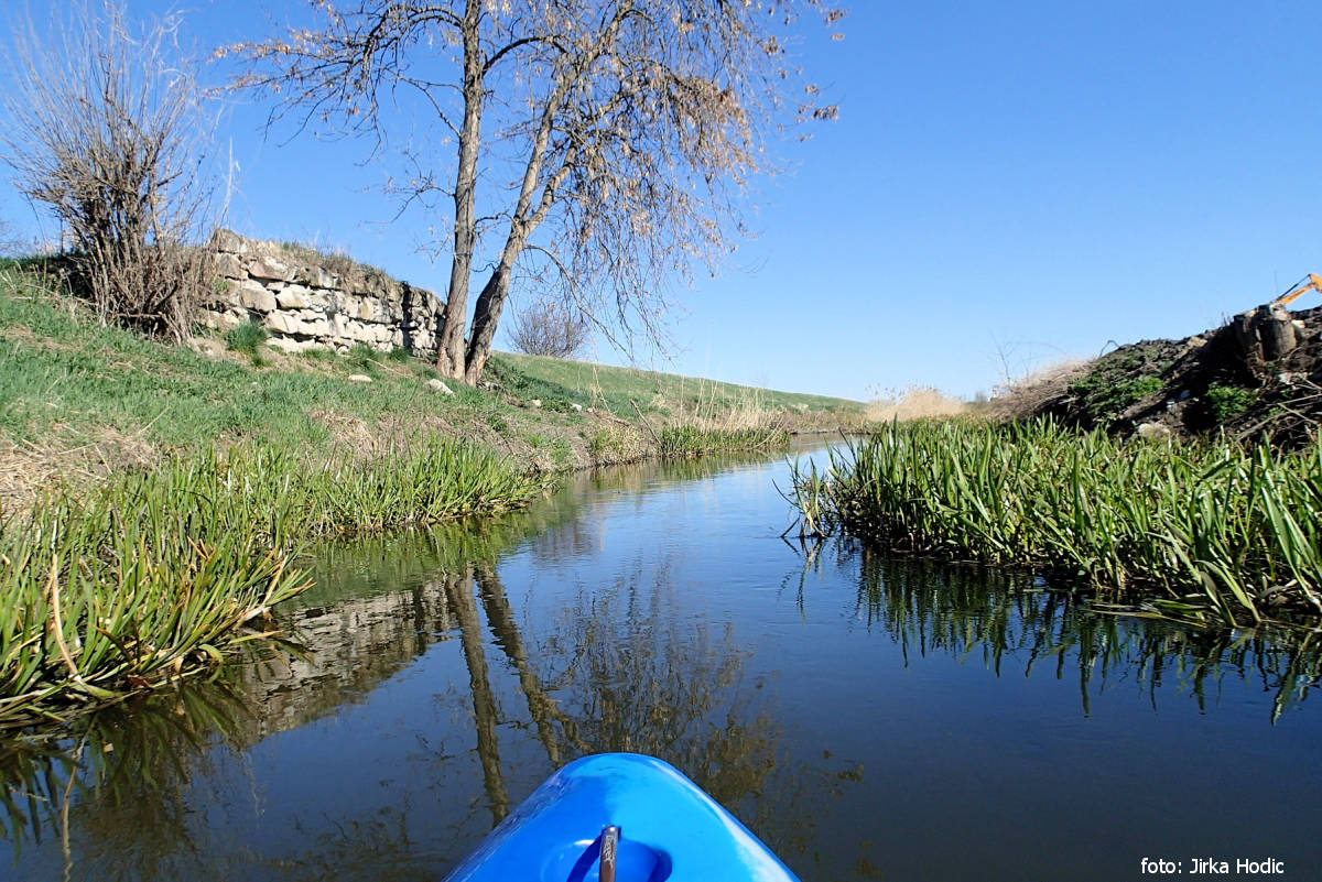 Přejíždím tedy o most výš. Tady už to tak slavně nevypadá. Katka říká: „Tohle nepojedeš?!“ (ten vykřičník za větou byl mnohonásobně větší než otazník) Vody je tu o dost méně, protéká asi dvoumetrovou uličkou hustým žlutozeleným rákosím, ale i přes znatelný proud je jí zdá se dostatek. Jdu na to.