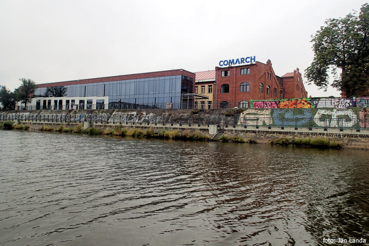 Za komorou už vjíždím do zastavěné části Wrocławi. Plavební kanál se středu města vyhýbá a po staré Odře přes centrum si netroufám. Podrobné informace o možném průjezdu se mi nepodařilo před odjezdem zjistit a z leteckého pohledu na online mapách to v centru vypadá jako v Benátkách. Držím se proto plavebního kanálu, ale v duchu si slibuji, že se sem jednou vrátím a historickou část Wrocławi si projedu. Za zdymadlem Zacisze se plavební kanál spojí se Starou Odrou, na břehu se střídají historické budovy s moderní architekturou. Je vidět, že se město postupně rozrůstá i do původních průmyslových částí.