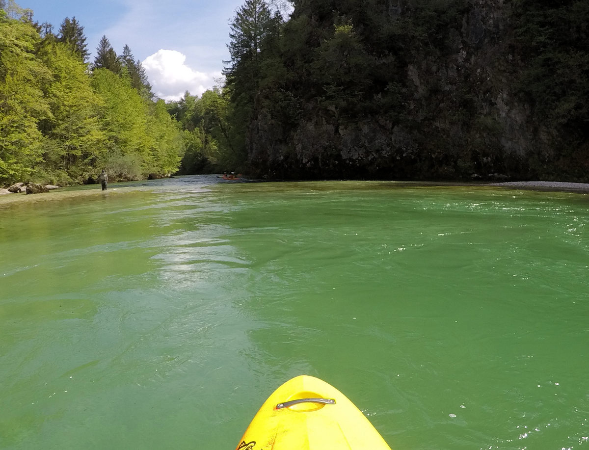 Přejíždíme asi 10 km níže k mostu pod jezem u Soteska, kde se chystáme na vyplutí. Vody není mnoho, ale bez potíží nám bude stačit. Je opět krasová a extrémně čistá, září ve slunci neskutečnými odstíny zelené. Nalepuji samolepku dopředu na loď a projíždím první peřej před mostem. Ani si nevšimnu kdy, ale najednou je samolepka pryč. Příště si ji musím schovat do vesty nebo do loďáku.