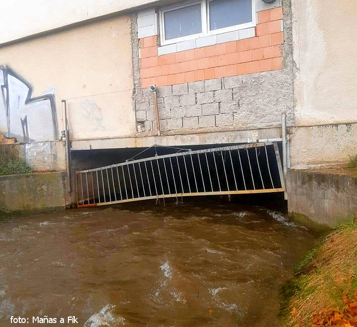 Dále řeka pokračuje s občasným šplouchnutím až ke sportovní hale, kde je velké úskalí. Doporučuju zastavit kousek pod poslední (zelenou) lávkou vedle hřiště na pravé straně. Vracáky tam moc nejsou, tak opatrně, protože řeka teče právě pod tou sportovní halou a vtok je přehrazen mříží kousek nad hladinou! Ale, jak jsme letos zjistili, ani to není konec nadějí. Mříž už není úplně v kondici a dá se s ní trochu hnout, takže pokud není příliš vody, dá se to s pomocí kamoše vyřešit.