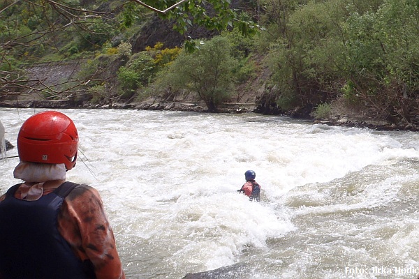 Nájezd středem nebo vpravo nezkoušejte. Někdo přenáší, někdo i plave. Dál se Vardar uklidňuje. Končíme po 13 km v Bašinu Selu.