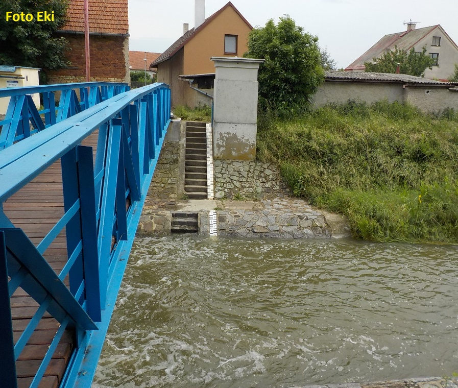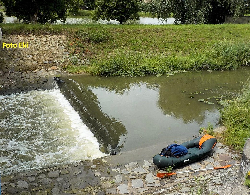 U pěší lávky vás čeká stupeň s válcem. Ten lze buď po prohlédnutí splout, nebo obtáhnout po břehu po chodníčcích na obou stranách toku.
