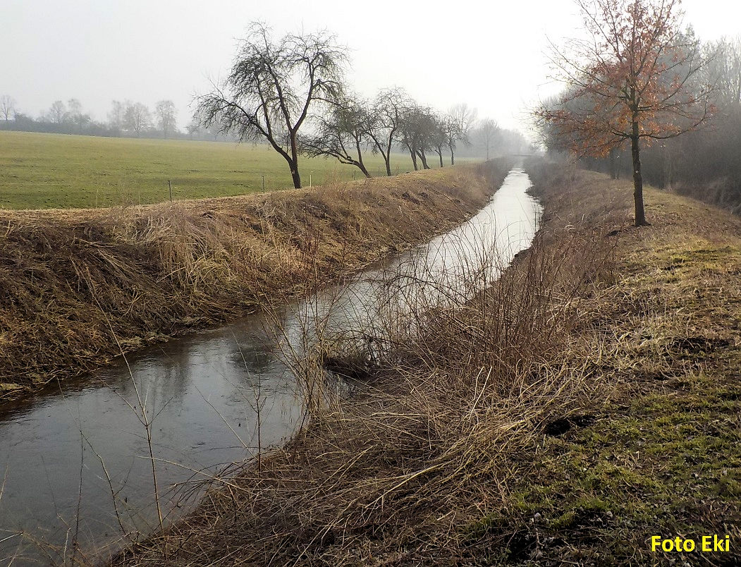 Pod Křincem Mrlina mírně proudí narovnaným korytem mezi poli.