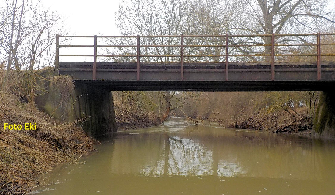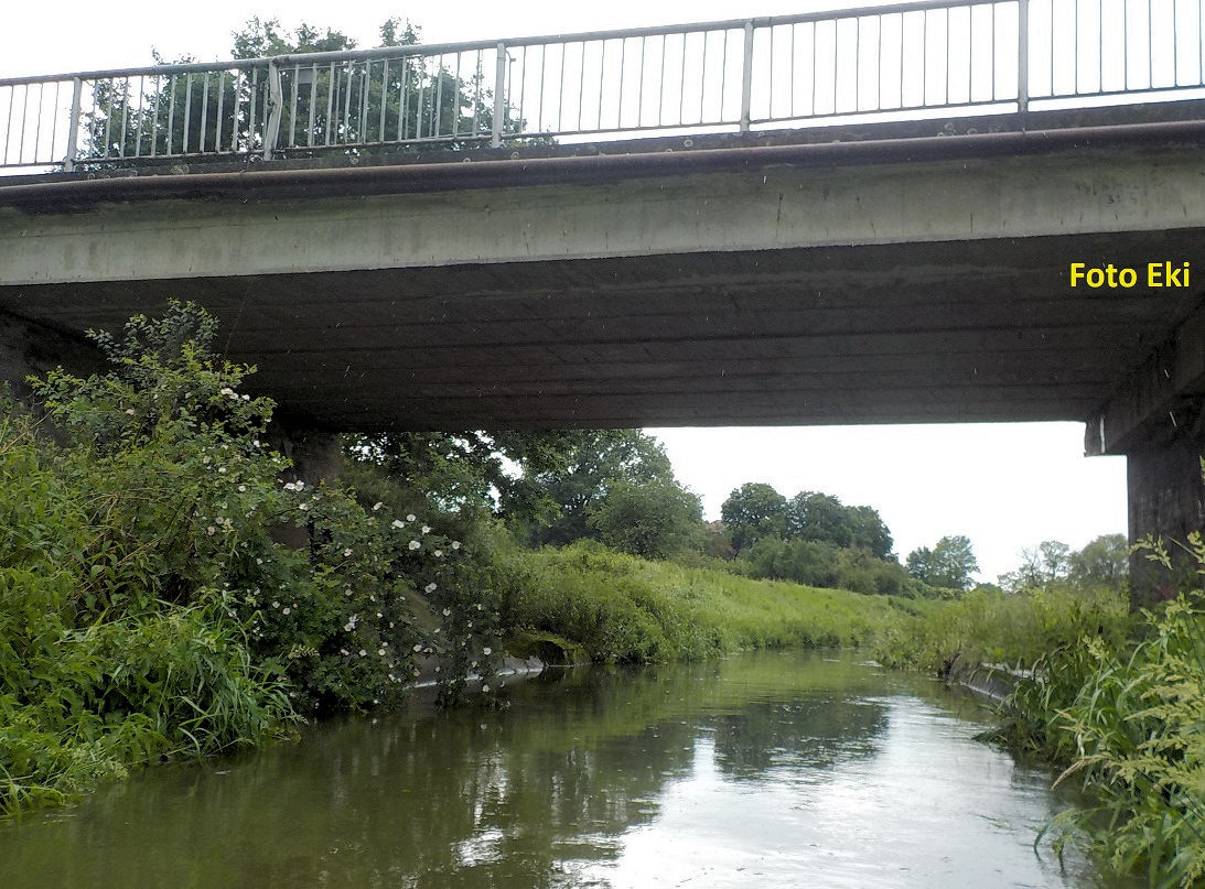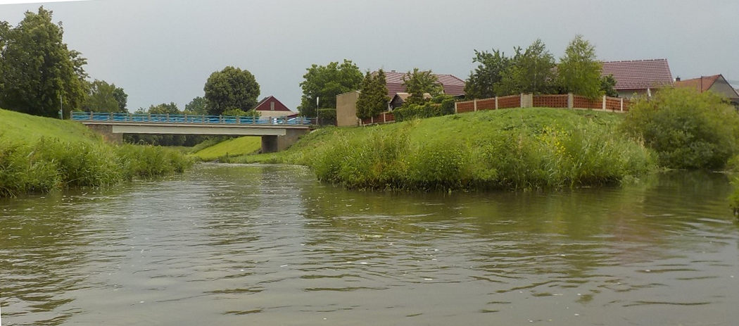 Podplouvám pak i modře natřený silniční most ve Vestci. Následuje další srovnaný úsek mezi poli, kde mi společnost dělají kachny a vousaté nutrie.
