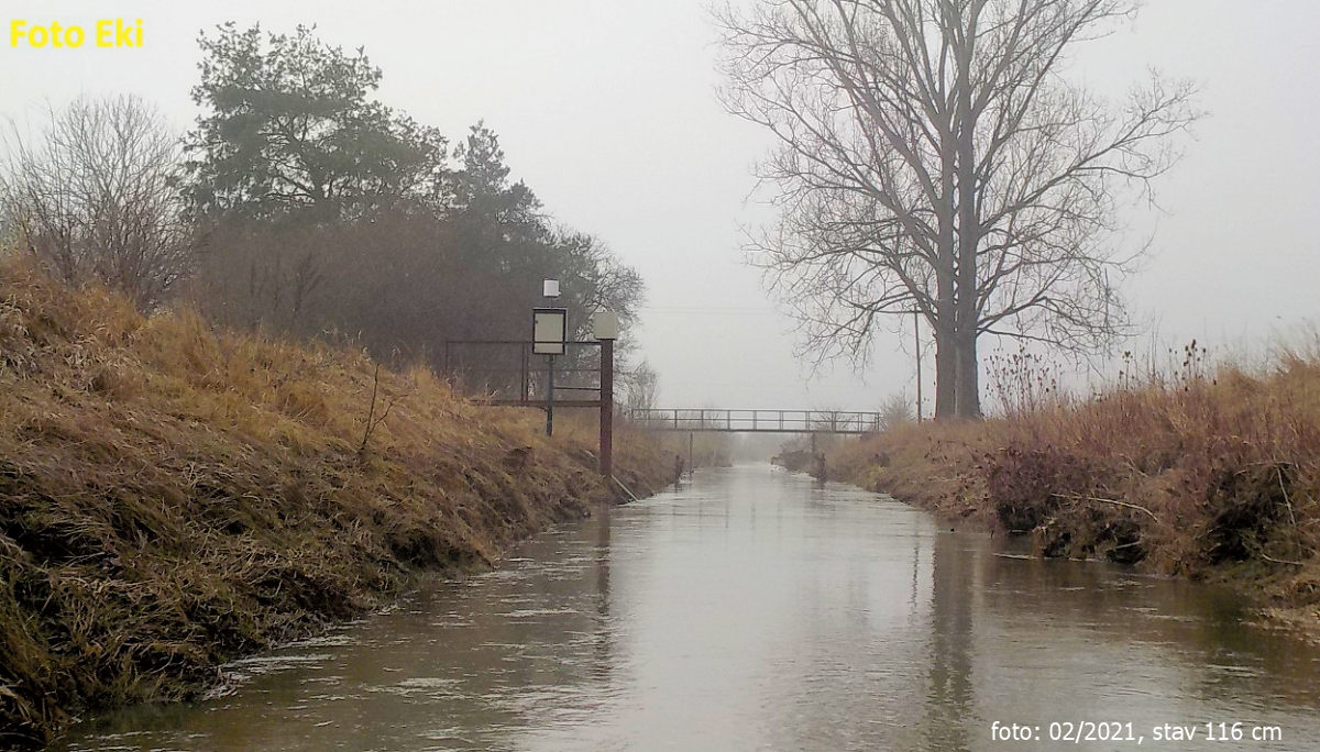 Vodoměrná stanice a pěší lávka přes Štítarský potok (stav 116 cm, únor 2021)