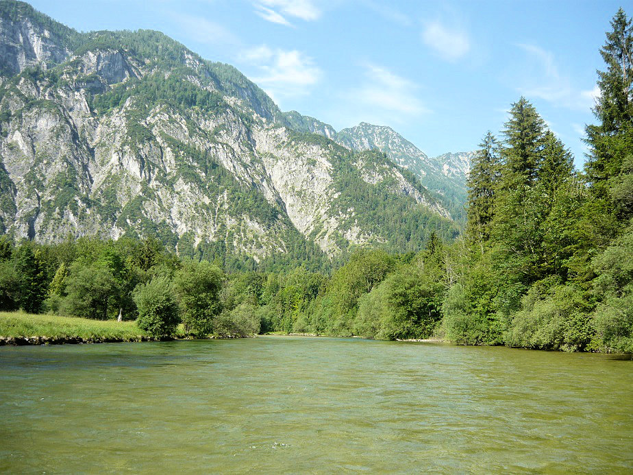 Od jezu jsou 3 km pěkně tekoucí říčky s výhledy na okolní vápencové vrcholy skupiny Dachsteinu. Pohledu zpět proti proudu dominuje hora Krippenstein. Příjemný proud utichá ve vzdutí jezu Kraftwerk Bad Goisern postaveného v roce 2017. Výstupní místo pro přenášení vlevo je dobře označeno. Po 1 km následuje nesjízdný jez Goiserer Polster, který se přenáší vpravo. Třetí a tím i poslední jez Weisenbachpolster by se měl přenášet vlevo. My jsme vzhledem ke stavu vody přetáhli loď přes dřevěnou konstrukci jezu vpravo.