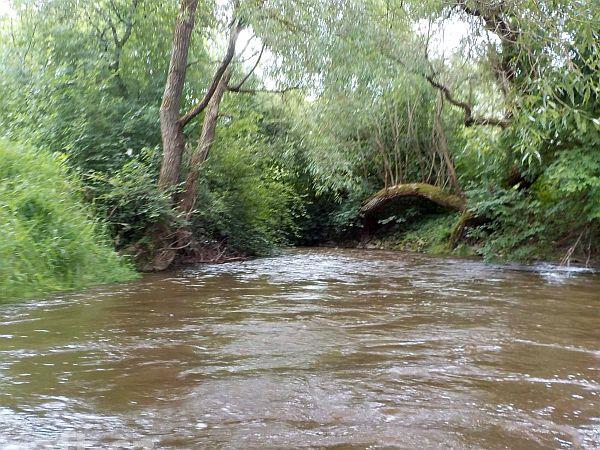 Blanice, úsek Záblatí/přehrada 8.6.2013, cca 9m3/s v Podedvorech, po povodni rozbitý jez u Zábrdskéh ...