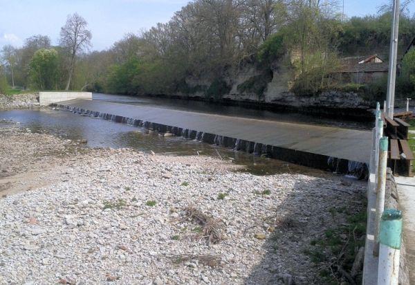 r.km 79,5 Jez Turnov má na pravé straně rybí přechod, po roštech nad ním lze přenést loď, 11/2023