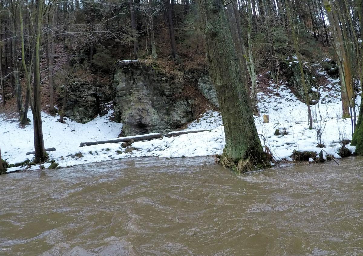 V dolní části Pekelského údolí, těsně za ostrovem se stromy leží v peřeji přes celou řeku padlý stro ...