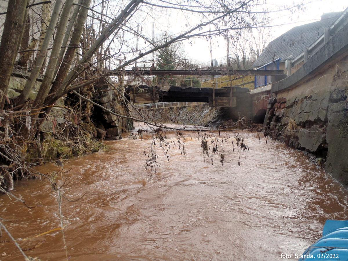 17,2 km Bělá lávka k fotbalovému hřišti od velké vody zatarasena klacky, začíná klidná voda před jez ...