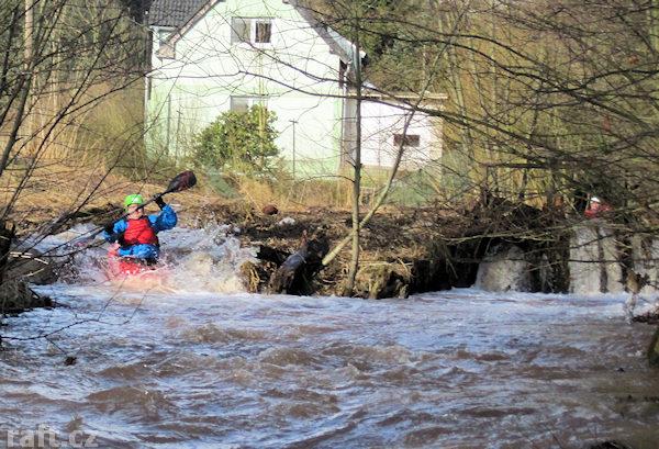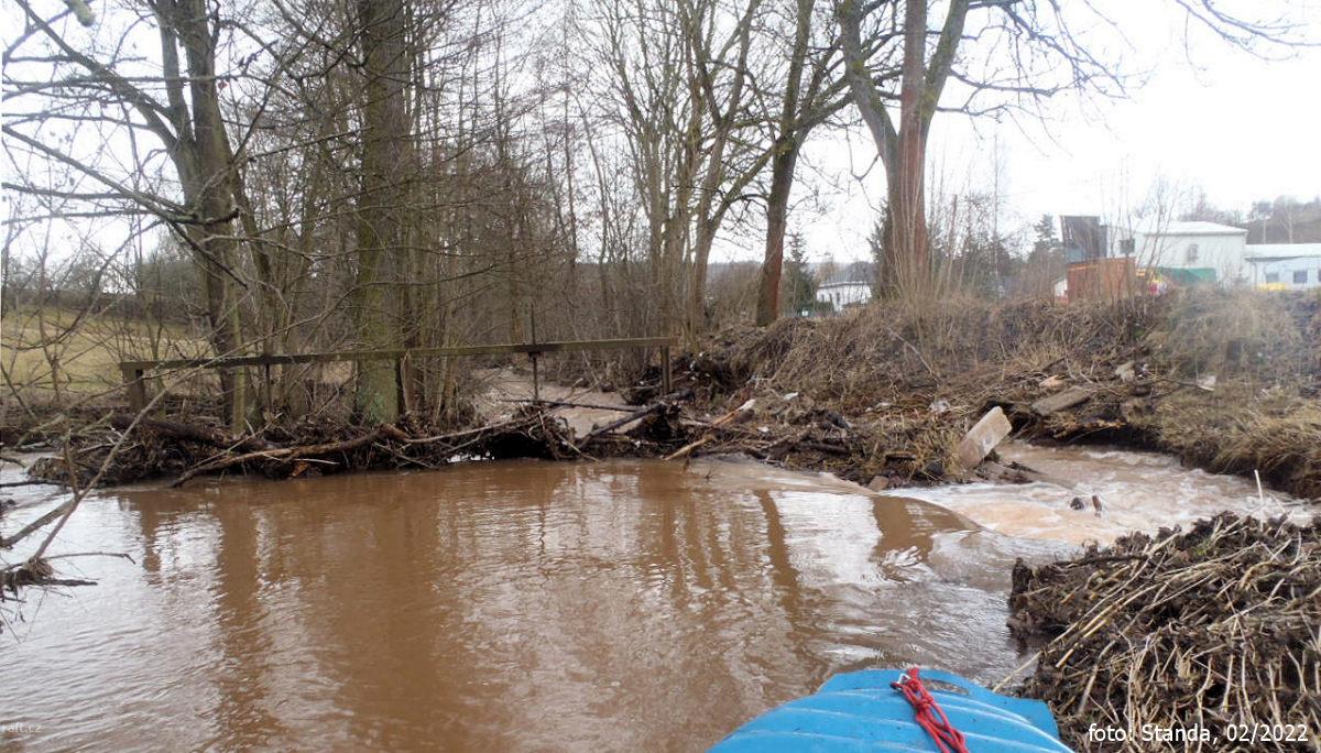 17,2 km Bělá lávka k fotbalovému hřišti od velké vody zatarasena klacky, začíná klidná voda před jez ...