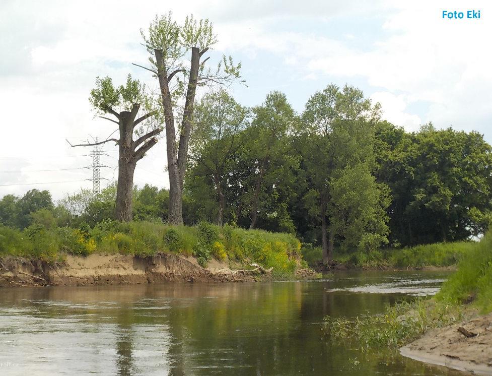 Mohutný padlý kmen přes celou řeku, cca na 21,3 km - mezi kamenným záhozem a Štěňkovem. Je to za zat ...