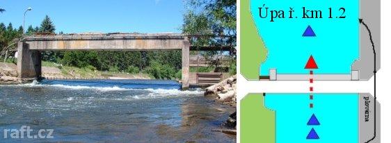 Pozor v Úpici, kde se opravuje most. Lešení zasahuje do toku v celé šířce, ční tam roxory proti vodě ...