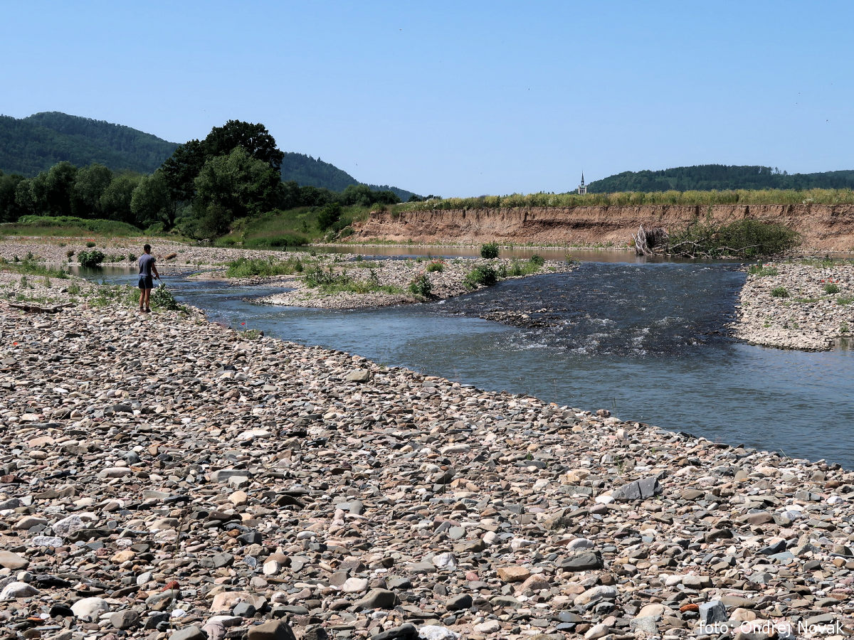 Krasna Góra 400 m prawo, bufet 300 m prawo, (z řeky není obec vidět)