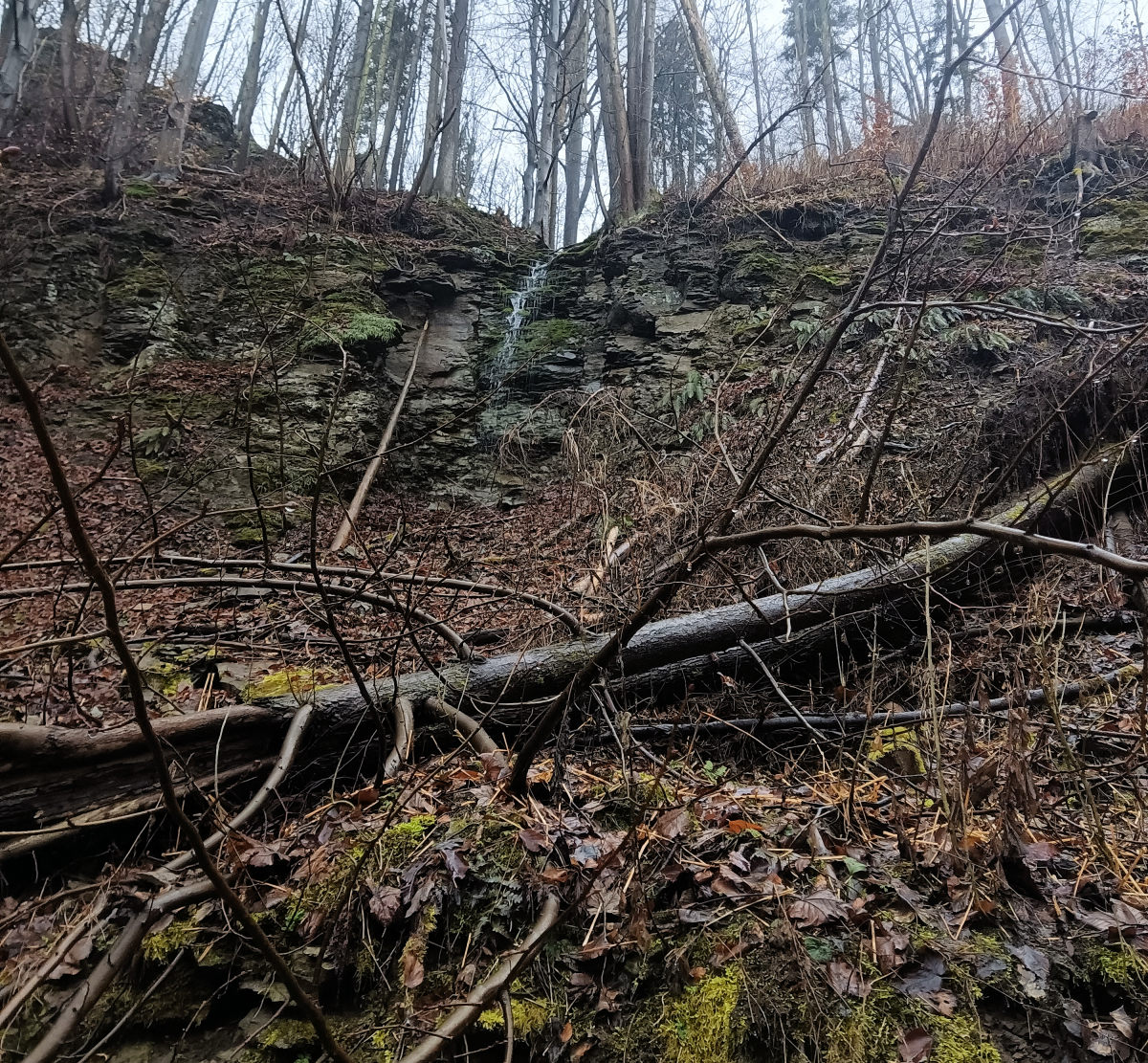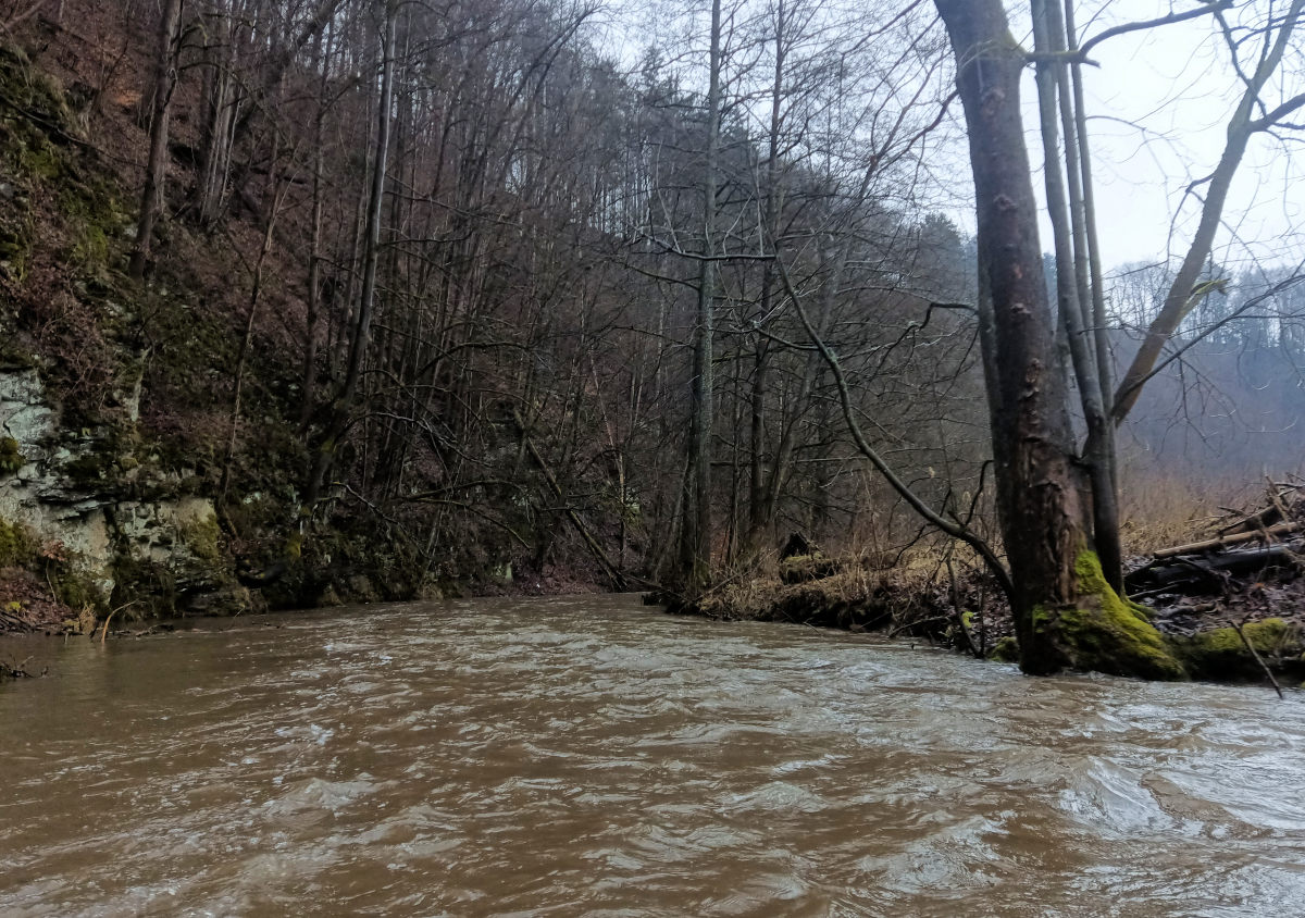 Následuje vzdutí jezu. Když ho přepádlovávám, najednou se vedle mě vynoří kormorán. Musel být pod vodou dlouhou dobu, vůbec jsem si ho nevšiml. Vystřelí jako šíp nad hladinu, roztáhne křídla a je fuč. Takto si představuji moderní střelu voda – vzduch. Jez se dá skočit nebo případně přenést. Je tam váleček, ale šikmá deska umožňuje bufnout naplocho a přejet ho. Charakter toku se nemění, stále jsou k vidění prudké lesnaté stráně s občasnými skalami.
