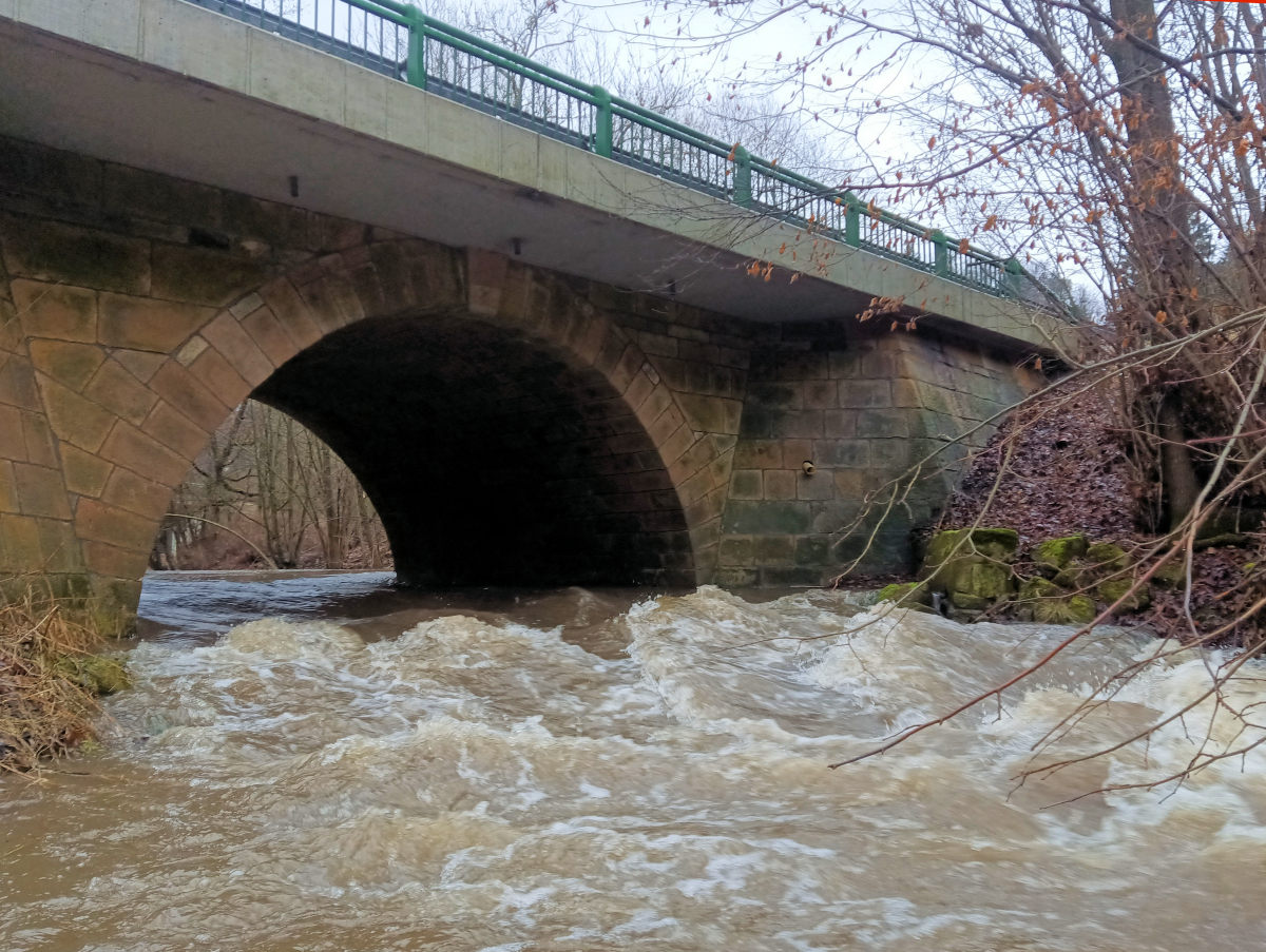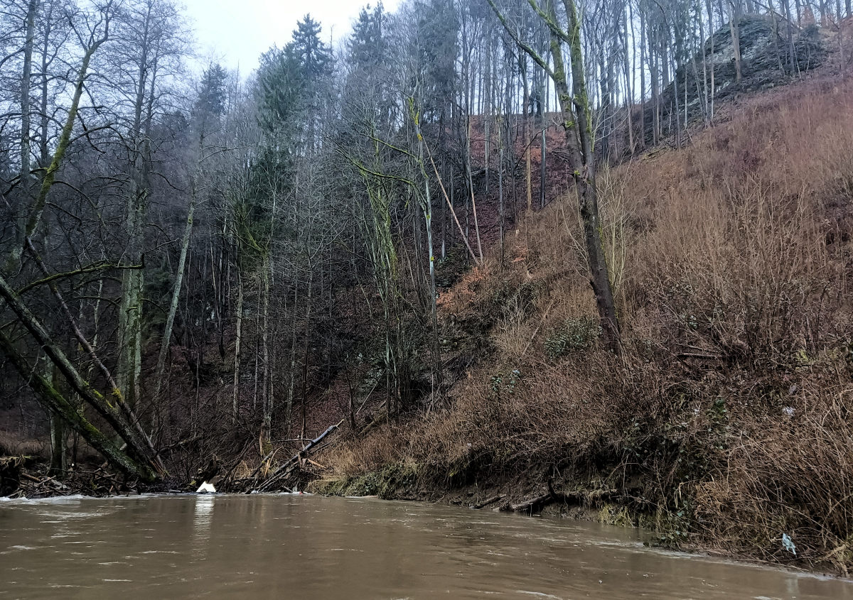 Za nimi následuje u silničního mostu šikmý jez bez obtíží splavný. Řeka se dostává na druhou stranu údolí opět se strmým srázem a již menšími skalami.