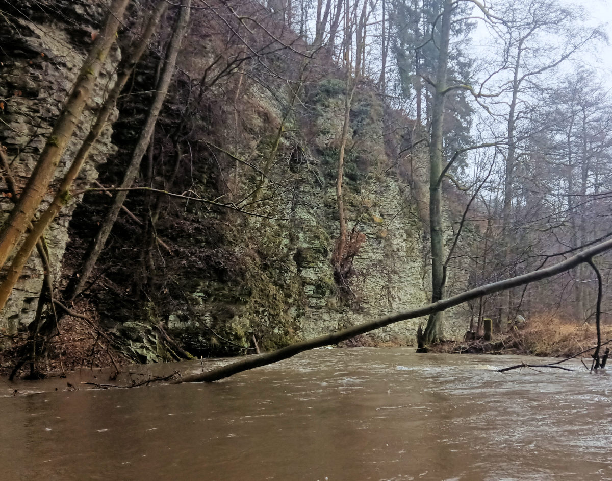 Po dojezdu do Petrovic se rozhoduji, zda končit či pokračovat. Času mám dost a tak volím trasu, kde již následují nějaké jezy. Hned v Petrovicích se po levé straně začíná objevovat strmá skalnatá stráň. Věřím, že mi někdo dokáže říci, čím je to způsobeno, kdy opuka tvořící skálu, je jakoby zalitá do betonu. Znám opuku jako systém desek, zde to vypadá, jakoby si příroda dala tu práci a vše dokonale vyspárovala. Vysoké skály tak působí zcela hladkým dojmem bez výraznějších výčnělků.