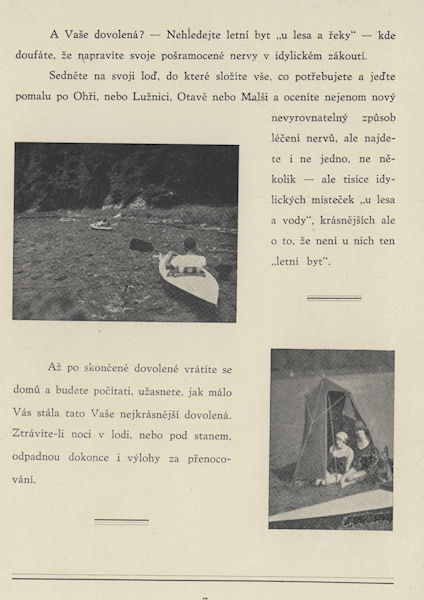 "V zájmu každého čsl. sportsmana jest, aby dříve než se rozhodně koupiti si člun, vyžádal si informace od naší tuzemské továrny a prohlédl si její výrobek. Jsme si jisti, že jeho kritika bude zrovna tak příznivá, jako mnohých jiných a že mu již ani nenapadne kupovati zahraniční loď a vyhazovati tak zbytečně peníze."