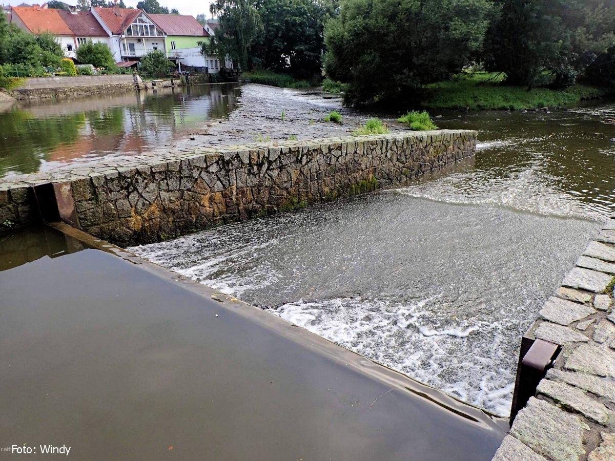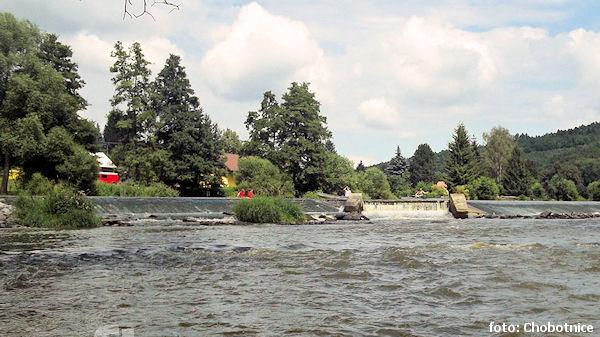 Jez Podělusy je zcela opravený a průjezdný sportovní šlajsnou u pravého břehu. Před šlajsnou jsou ka ...