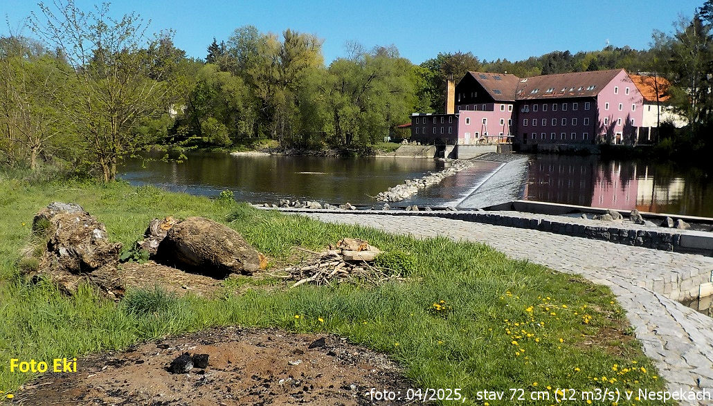 zapór z przepusti w środku przenosić lewo albo prawo wysoki (m) 1,5 długo młynówka prawo, !! jez Kaňov (propust je zahrazena vysokým hrazením, sjízdný jen za středních stavů - při špatném nájezdu do propusti hrozí stržení do nebezpečného jezu!! Většina vody je navíc odvedena náhonem do elektrárny, pod jezem je dlouhý úsek suchý.) próg skalny, kaskada 0,6 km |
